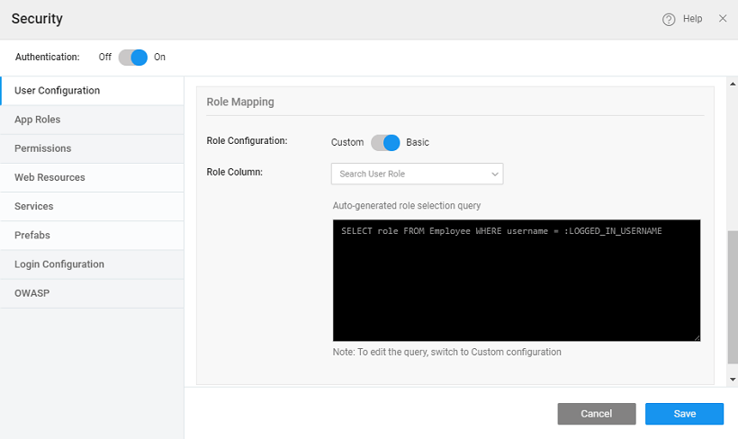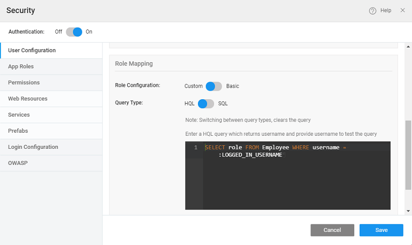 Role Configuration can be Basic or Custom. In the case of Basic, a HQL query will be built by default in read-only mode. In case of Custom, you can change the query to suit the app needs.