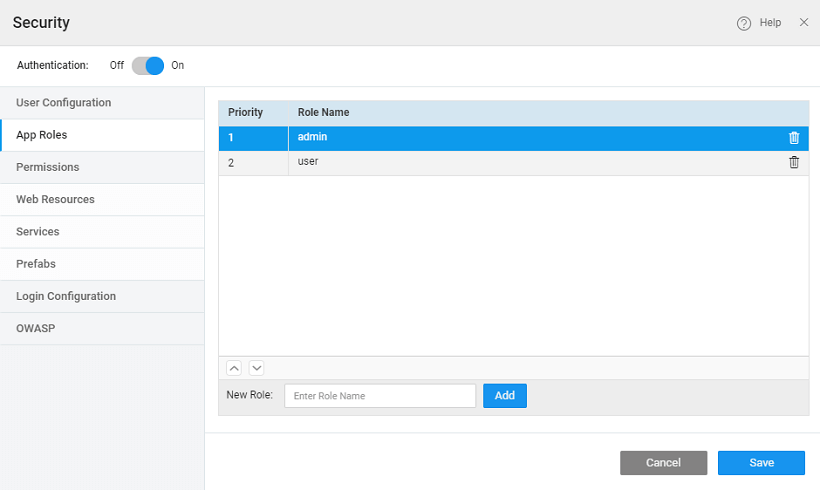 You need to add the roles that you want to use in your application as per the roles in the above-mentioned Security Providers and Roles in the App Roles tab. There are two App Roles - admin and user offered for all providers. They are for authorization and provided out of the box. Users can add/remove to suit their needs. Using the arrow keys, you can set the role precedence for multiple roles within an application. This is particularly useful when a single user has multiple roles with different overlapping functionality. For example, Manager has two roles – admin and user. And for admin the landing page is set as EmployeeDashboard, while user has the landing page as EmployeeProfile. Based on the role precedence the corresponding landing page takes priority, i.e., when Manager logs in, if admin role has higher precedence then EmployeeDashboard page is displayed, if user role has higher precedence then EmployeeProfile page is displayed.