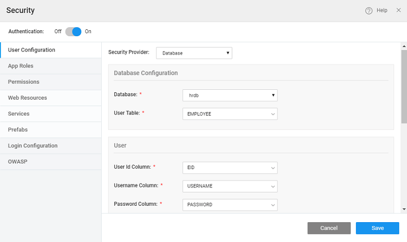 • As an example, if you select Database as Security Provider; sample hrdb as the Database; User as the Entity; Username, Userid and Password as themselves, then the sample query would be provided along with a text box to enter a sample value for username and test the query.