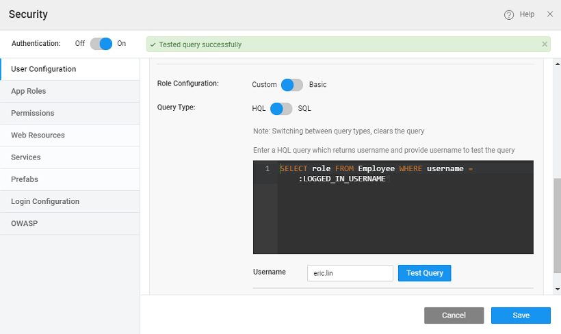 • In the case of Custom Role Configuration, Query Type can be set to HQL or SQL. By default, HQL is selected and a default query is generated, which can be modified.