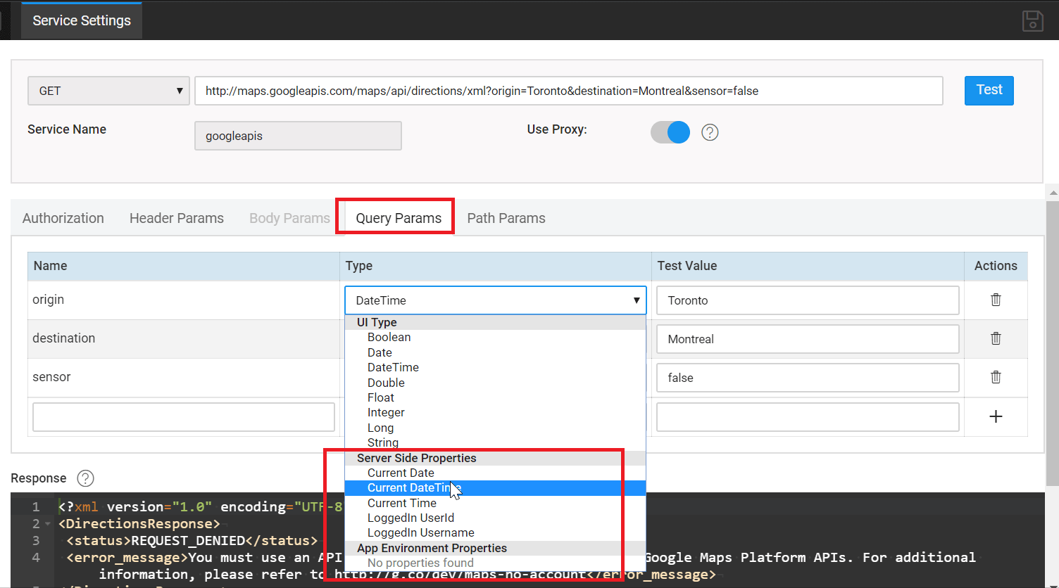 When working with REST Services, it is essential to protect your API keys and passwords and ensure your app sensitive information hides from the UI and network calls. You can do this by using proxy server when configuring REST Services. For this, you should use App Environment Properties or Server Side Properties for Header and Query params.