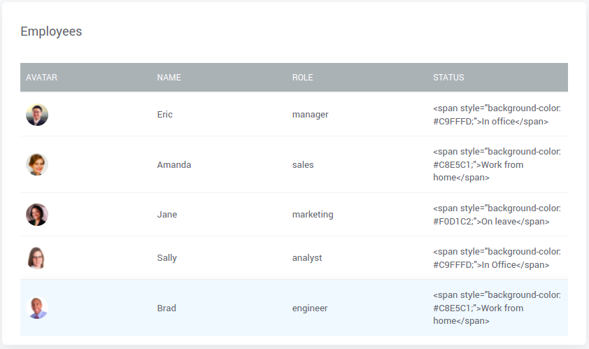 In the following example, Datatable contains employee details and their current status. The status column uses HTML with inline styles, posing a potential XSS attack threat.