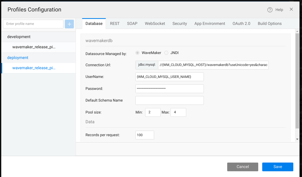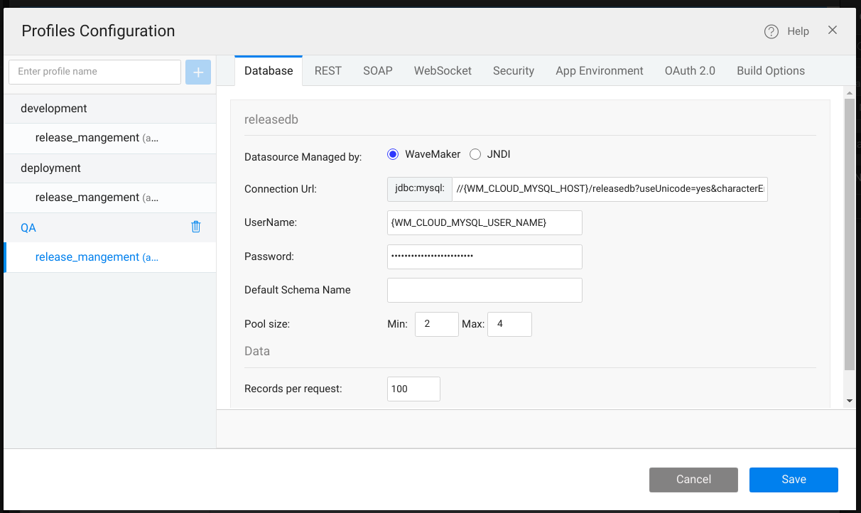 The Deployment Configuration Profiles, used with the Deploy option, are editable. The values are set from the configuration of the underlying services at the time of import/creation. You can change them according to the Deployment Environment settings.