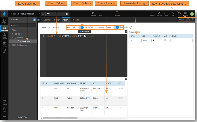 • The queries can be in HQL or Native SQL. These queries can be saved and used via the Database APIs generated.