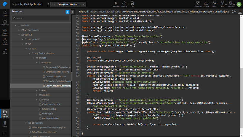 • Separate controller classes are generated for query and procedures with names as QueryExecutorController and ProcedureExecutorController respectively in package <service_package>.controller.