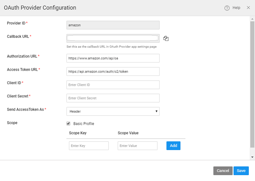 • Authorization URL and Access Token URL of the OAuth service provider for obtaining the authorization and access to the service. These fields are auto-populated in case of the selected providers, else you need to enter them manually.