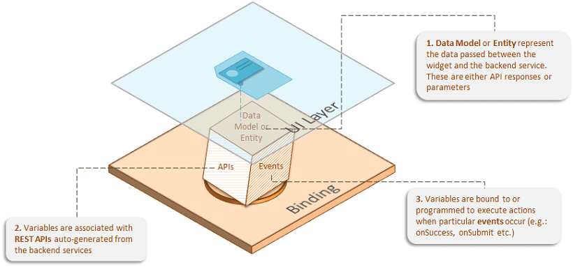 Variables function by invoking the associated REST APIs on the server-side, invoking the client-side JavaScript events that are associated or bound by configuration, after the response is obtained. Variables play a significant role in binding the UI and the backend services layer together through configuration and events, eliminating the necessity to write a lot of code.
