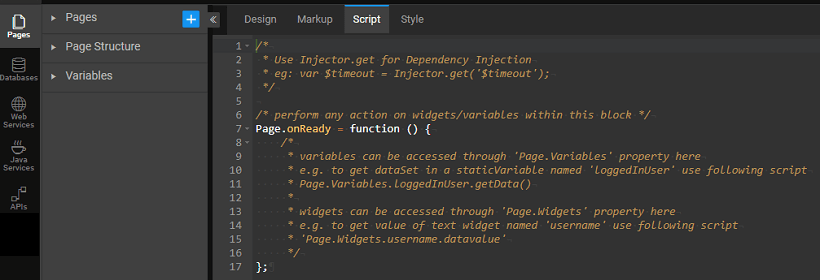 Page script can be accessed from the script tab on your project workspace. Using JavaScript, the functionality of your project can be enhanced. The various methods and properties associated with each of the Studio elements can be found in the API Documentation.