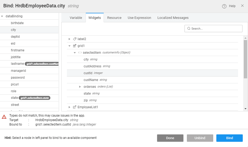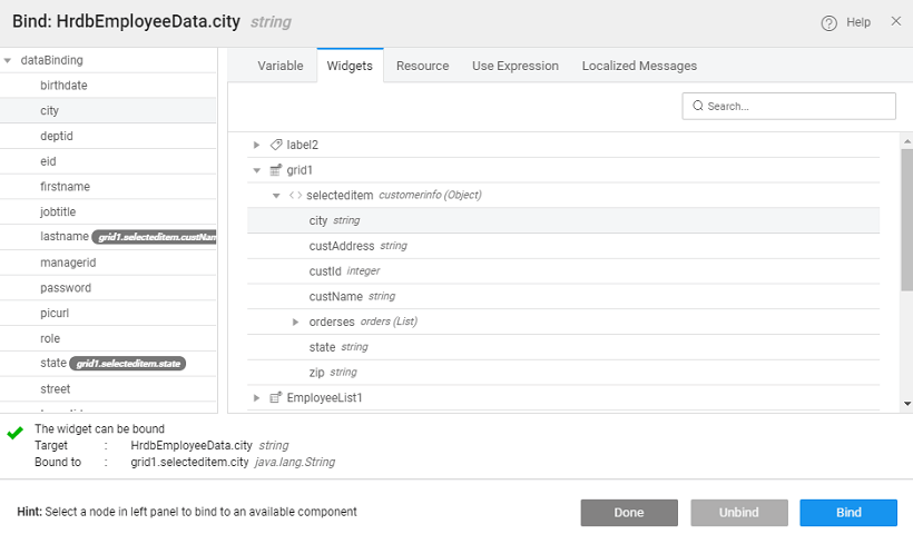 2. The Bind dialog displays the binding options i.e. a list of everything that you can bind to, including all variables, widgets and so on. You can bind to widgets, variables that are defined on the current page, or that are defined at the app level.