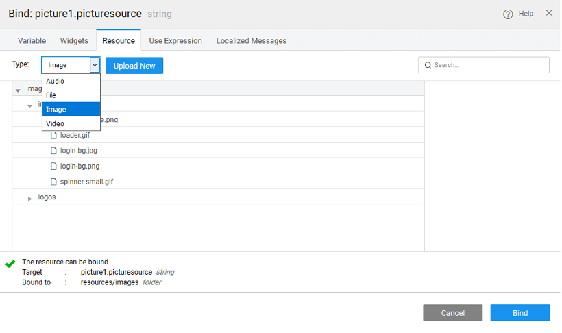 1. From the Property panel of the media widget, find the Video section. Locate the MP4 Source Path option and click the Bind icon represented by a chain-link as shown in the picture below; a Bind modal dialog pops-up.