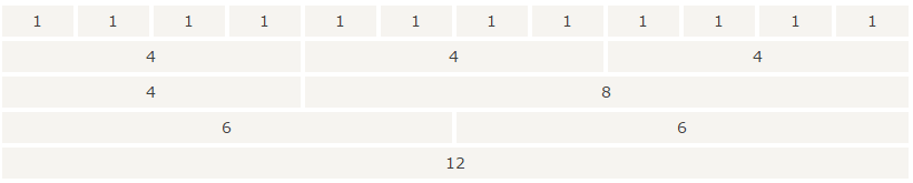 The following image gives you an idea of the flexible design that grid layout offers. The first row has three columns with the width being 4+4+4; second row three columns - 1+10+1; the third row with two columns - 6+6 and the last row same as the first row.