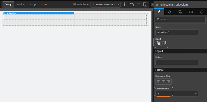 • add columns to the row from the properties panel of the selected row. When adding columns, WaveMaker ensures that the sum of all the column widths does not exceed 12.