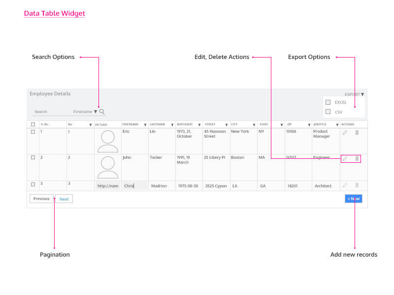Data Table provides a user interface to perform CRUD operations for data from a database, by integrating the editable actions with their corresponding CRUD APIs that are generated automatically during Database Integration process through Database CRUD variables.