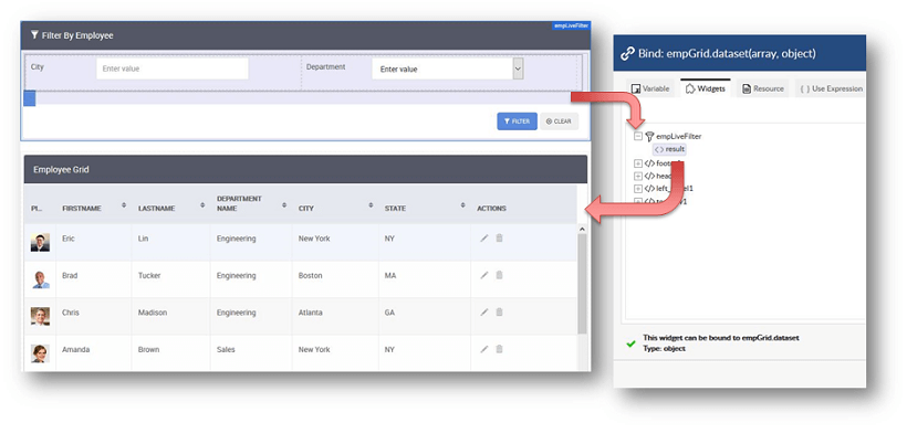 Live Filter provides data filtering UI and functionality. Live Filter can be bound to a data source from the database through the Database CRUD Variable. It returns filtered results which in turn can be bound to any widget. When designing in WaveMaker, Live Filter offers the following features to be configured: