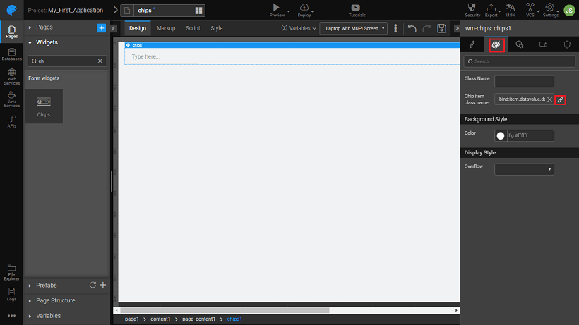 - Drag and drop the chips widget onto the canvas.