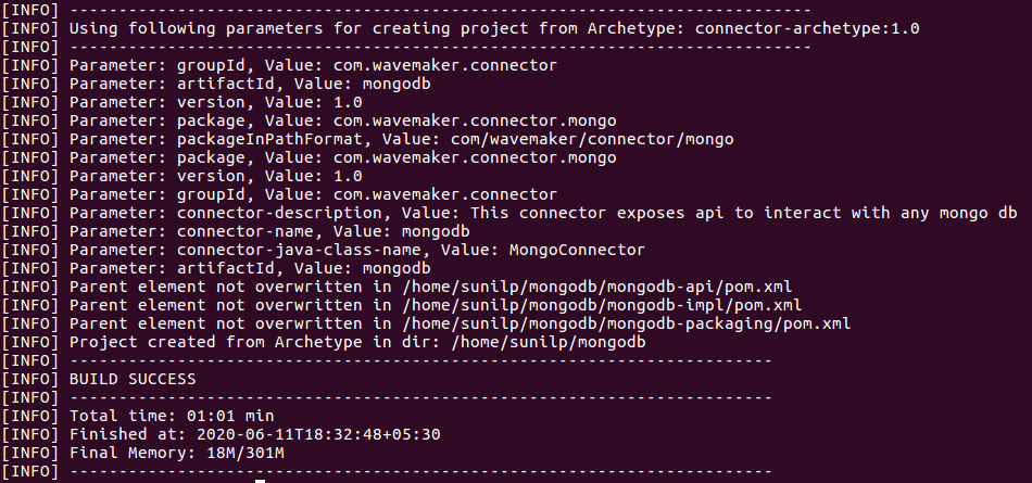 mvn archetype:generate –DgroupId=com.wavemaker.connector -DartifactId=mongodb -Dversion=1.0
