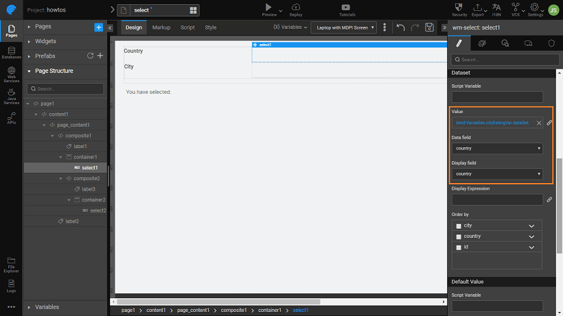 3. Bind the first Select widget to the _citylistingVar _dataset. Set the Display Field and Data Field to the Country field of the dataset.