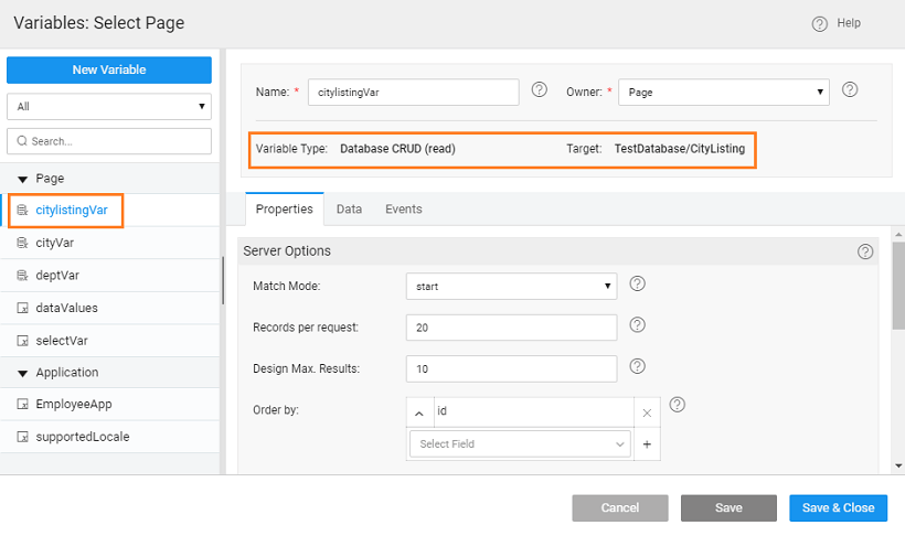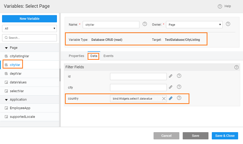 4. Create another Database CRUD variable (say, cityVar), bind it to the CityListing dataset and set filter on the Country field to the Country Select widget datavalue.