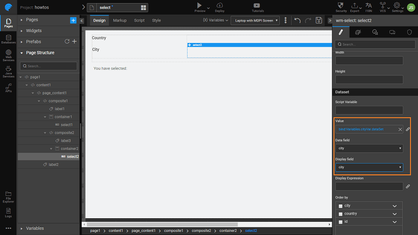 5. Bind the second Select widget to the variable (_cityVar) _created in the above step. Set the Display Field and Data Field to the City field.