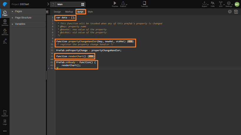 Enter the following function, too, within Prefab.onReady function after the above code. This code is to set up the visual rendering of NVD3 chart. Click here for the code