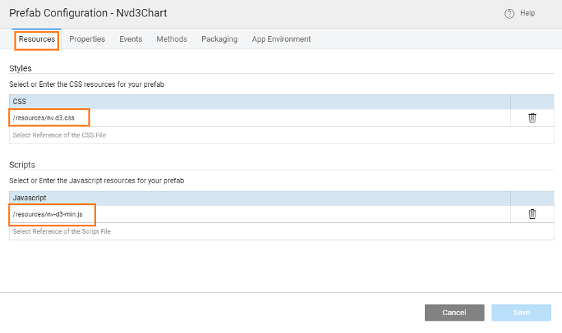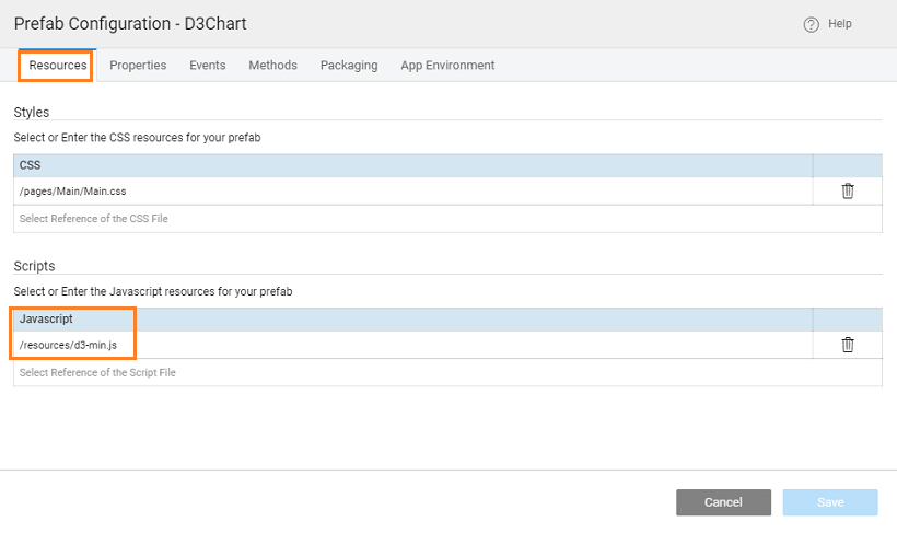 • From Resources, include the script and css files imported earlier, you can pick from the drop down list