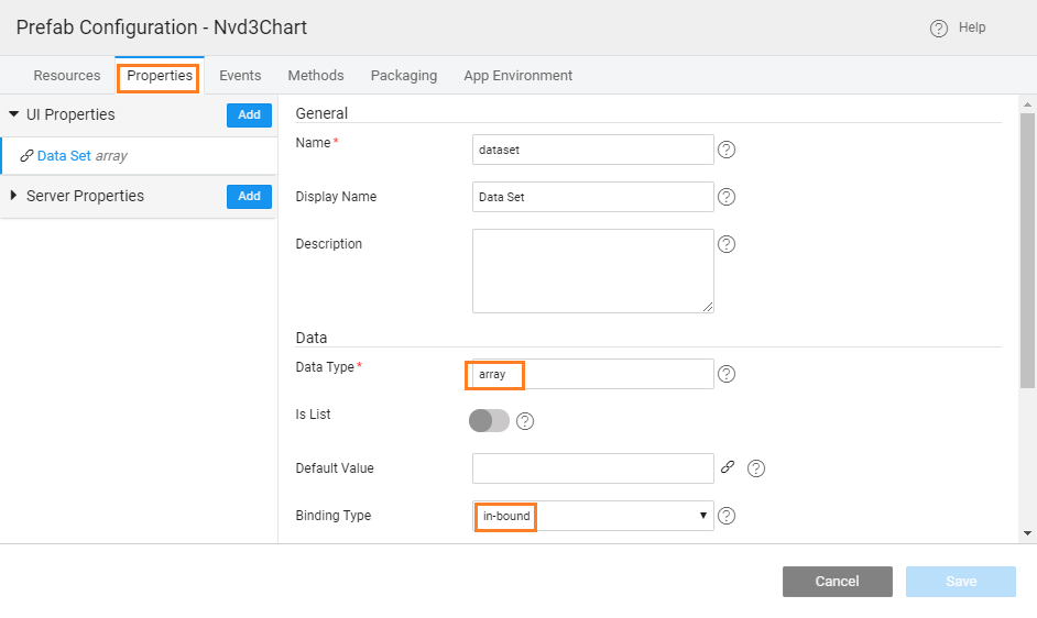 • Add property dataset, with text as widget, array (type if not selectable) as type and in-bound as the bindable attributes.