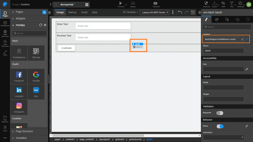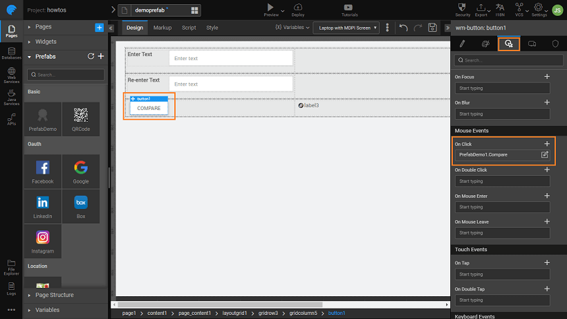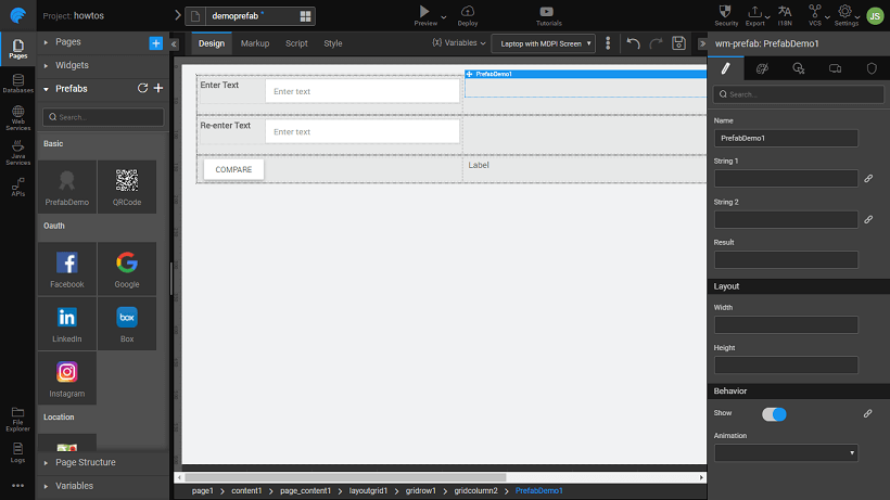 1. Drop two texts strings for comparison input to Prefab, a label to hold the result from the Prefab, a button to trigger the Prefab and the Prefab on the canvas. Your canvas should look like this (we have used a Grid Layout for widget placement)