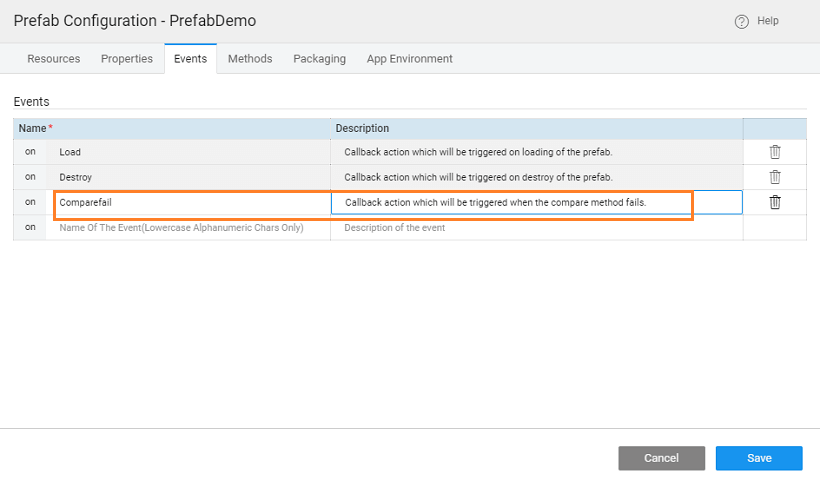 • In the Events tab, add an event (Comparefail) which will be triggered when the comparison of strings fails. The event will be defined in the JavaScript of the Prefab, the application using this Prefab will be defining the action for this event. Note, by default two events are already given - Load and Destroy