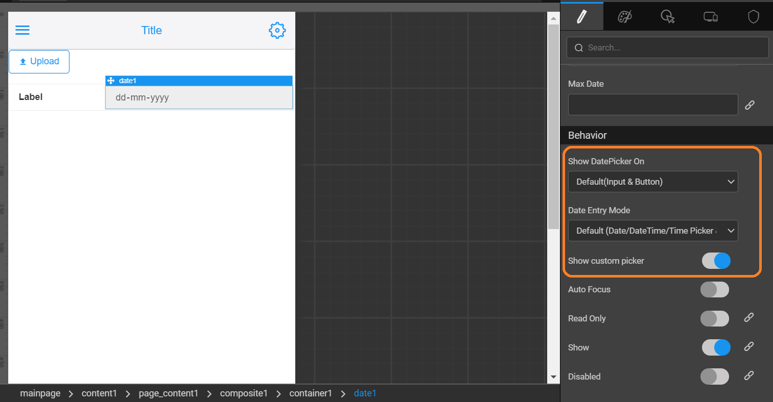 When setting the Show Custom Picker property to true, the Show DatePicker On property and Date Entry Mode property will enable. For more information, see datetime properties.