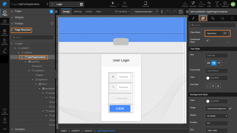 - Select the page container and change the Class name and Image location from the Style property to change the background image and style