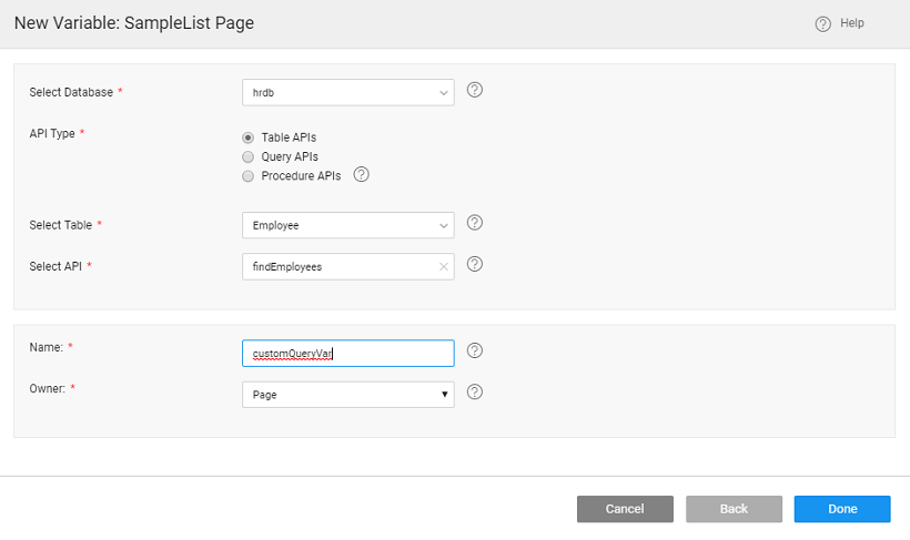 3. Create a Database API Variable named customQueryVar for the page created in previous step and set