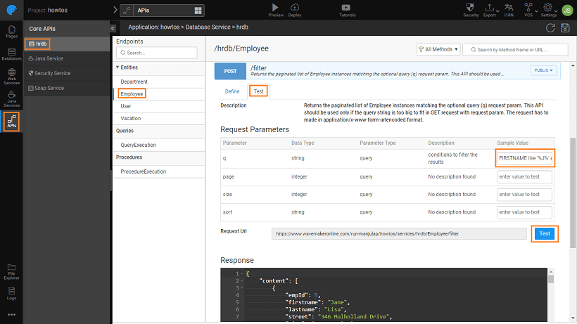 1. From the API Designer, select Employee Entity under HRDB and select POST / filter api - Returns the list of Employee instances matching the search criteria.