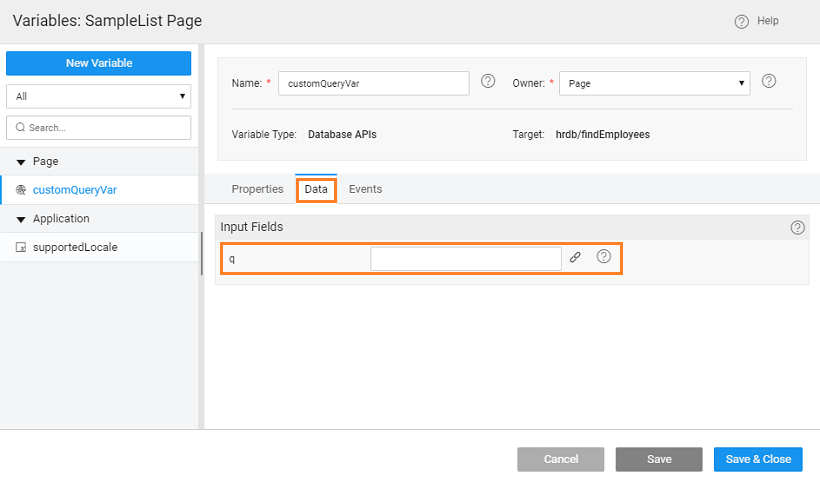 4. Notice in Data tab of the Service Variable q Input Field. This will be used to construct the dynamic where clause on Employee for findEmployees method.