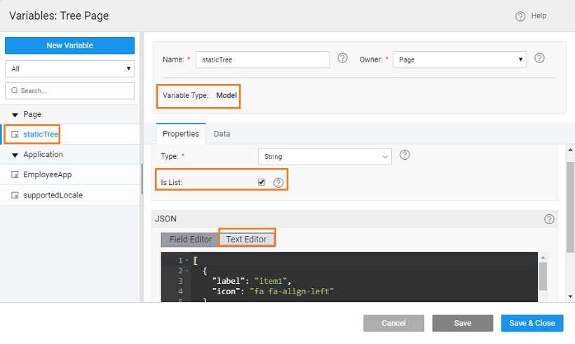 - Create a Model Variable, say staticTree, giving the structure of the data to be displayed in the tree. Ensure that the IsList check box is selected.