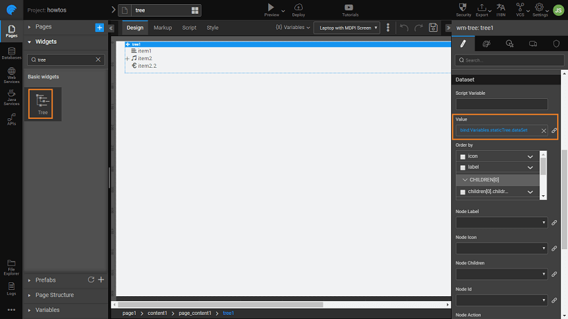 - Next, bind the Dataset -> Value property of the tree widget to the dataset under the model variable created in the previous step (staticTree -> dataSet). You can see the preview on the canvas.