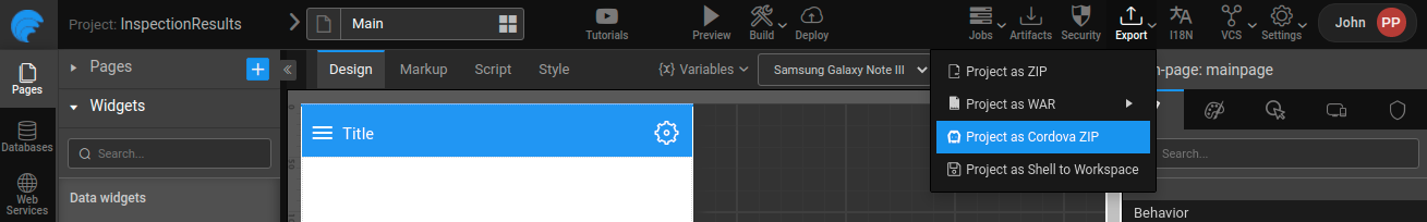 1. In the top right menu bar of WaveMaker Studio, go to Export and click Project as Cordova ZIP.