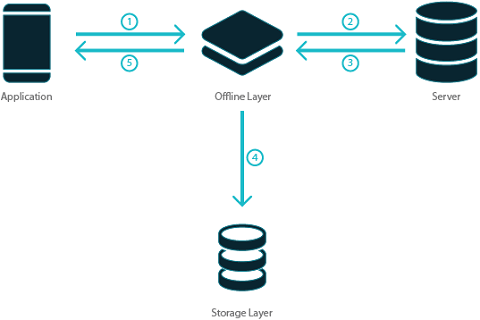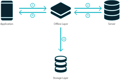 The offline layer intercepts all data requests. When the app is online, it forwards the request to the server and receives the responses from the server. When the app is offline, it consumes the request and provides the response. The offline layer includes: