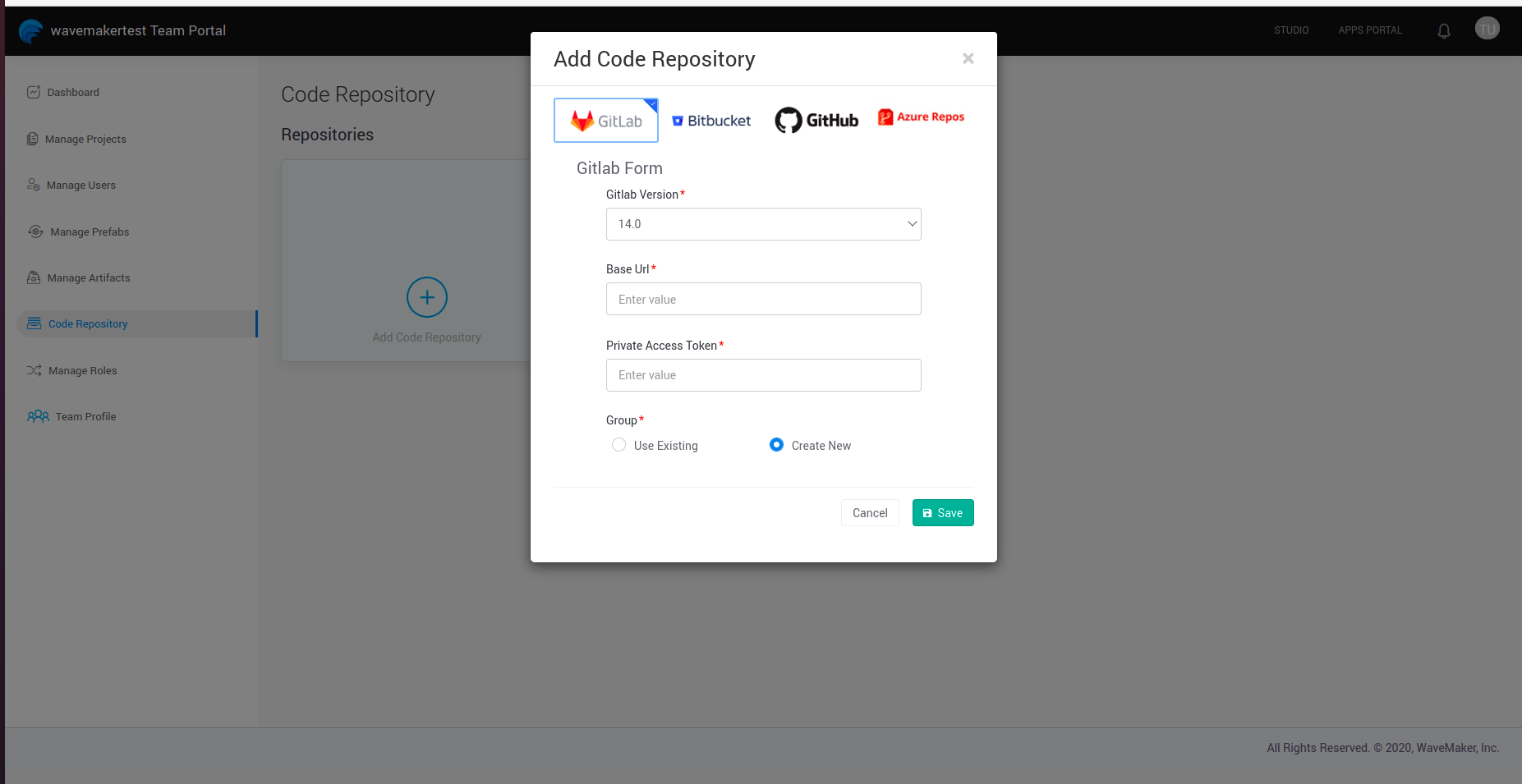 • After selecting Add Code Repository, select the repository type and provide the required details for adding the repository. As default providers, WaveMaker supports Gitlab, Bitbucket, Github and Azure for external VCS configuration. Select Save to save the changes.