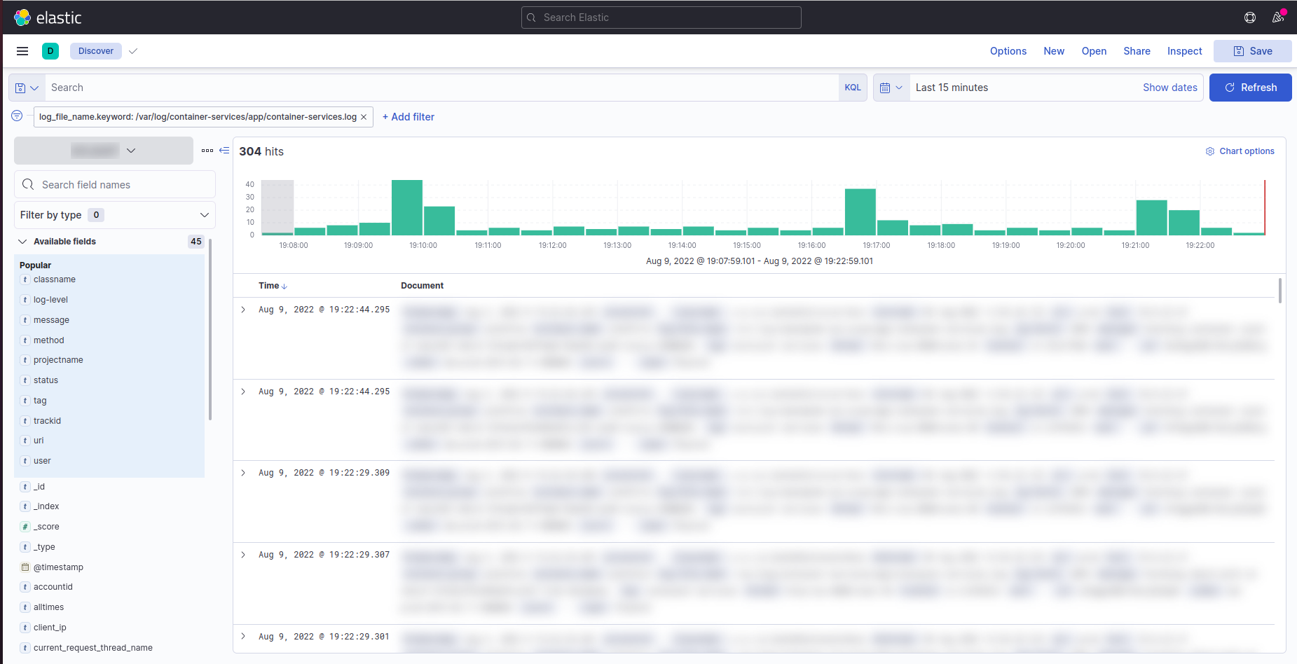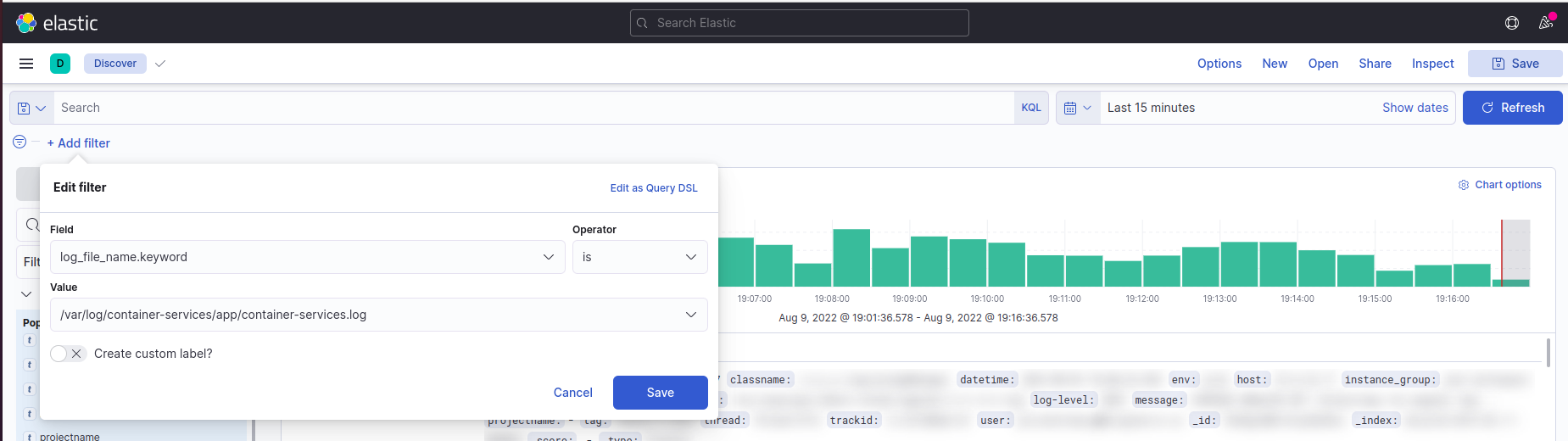 • Select Discover from the Kibana and add the Filter by selecting log_file_name.keyword as container-services.